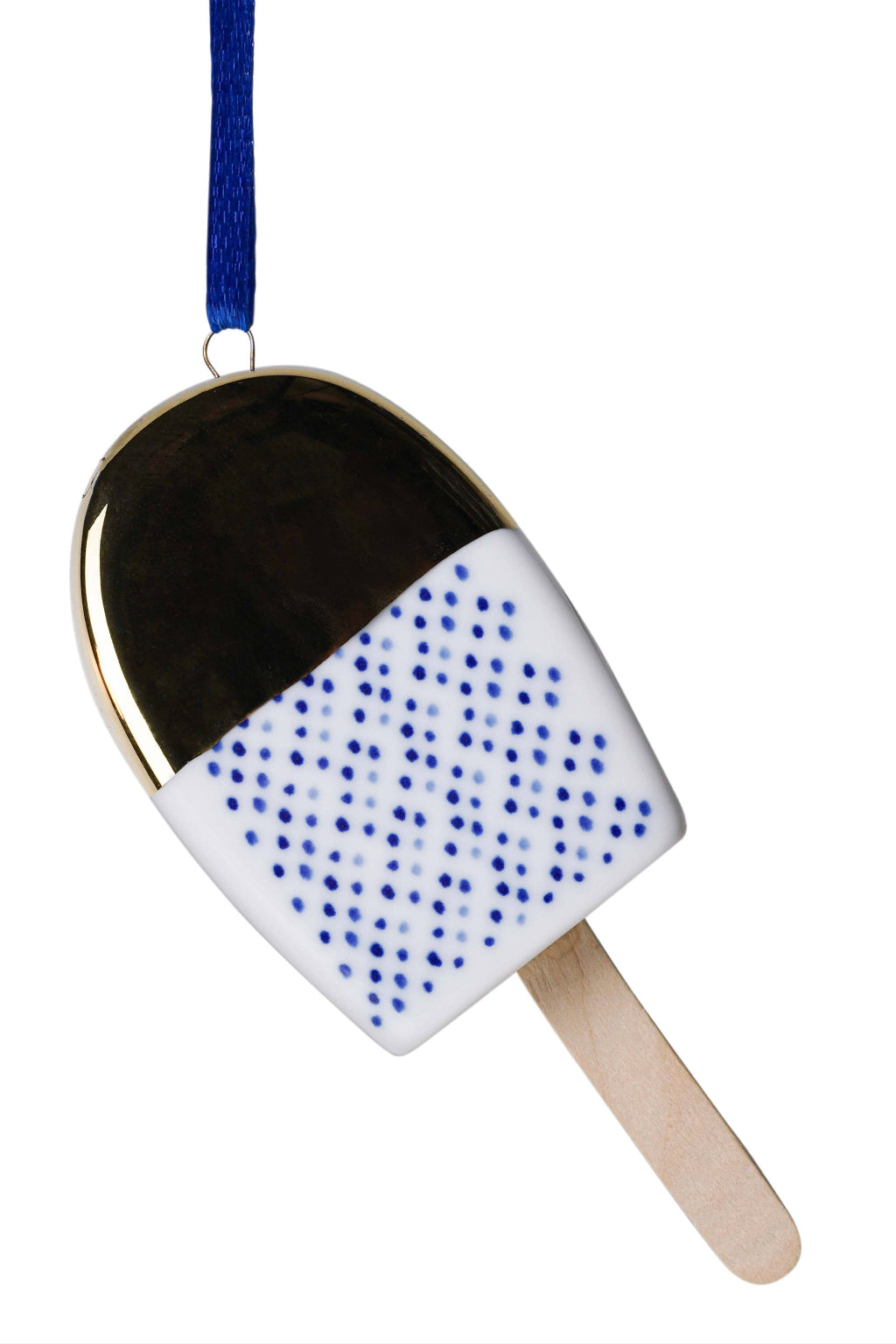 Decorate the Christmas tree with this fun Christmas ornament in the shape of an ice cream on a stick. The ice cream has the classic shape of the first ice creams on sticks that were produced. The white porcelain ice cream has a playful Delft blue decoration and hangs from a blue ribbon, making it easy to hang the ornament in the Christmas tree. The top half of the ice cream is dipped in gold-colored paint for an extra festive effect. Candy and ice cream have been handed out or eaten at Christmas for centuries. Think of red and white candy canes or the well-known gingerbread houses and men. Christmas was always seen as the most important holiday of the year, and candy or ice cream was something very special that children could enjoy extra during Christmas. It has now become a true trend to fill your Christmas tree with all kinds of treats, such as Christmas wreaths or chocolate Christmas balls. Tasty, but perishable.