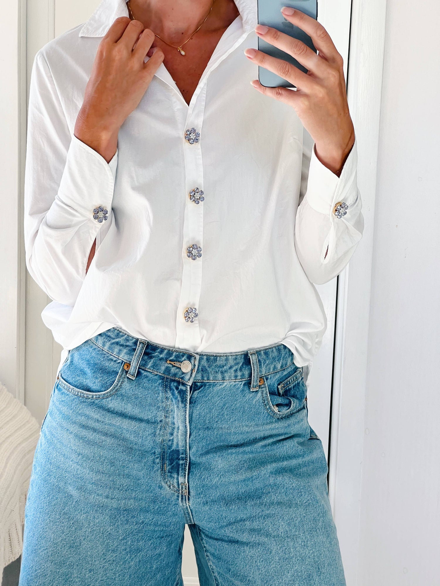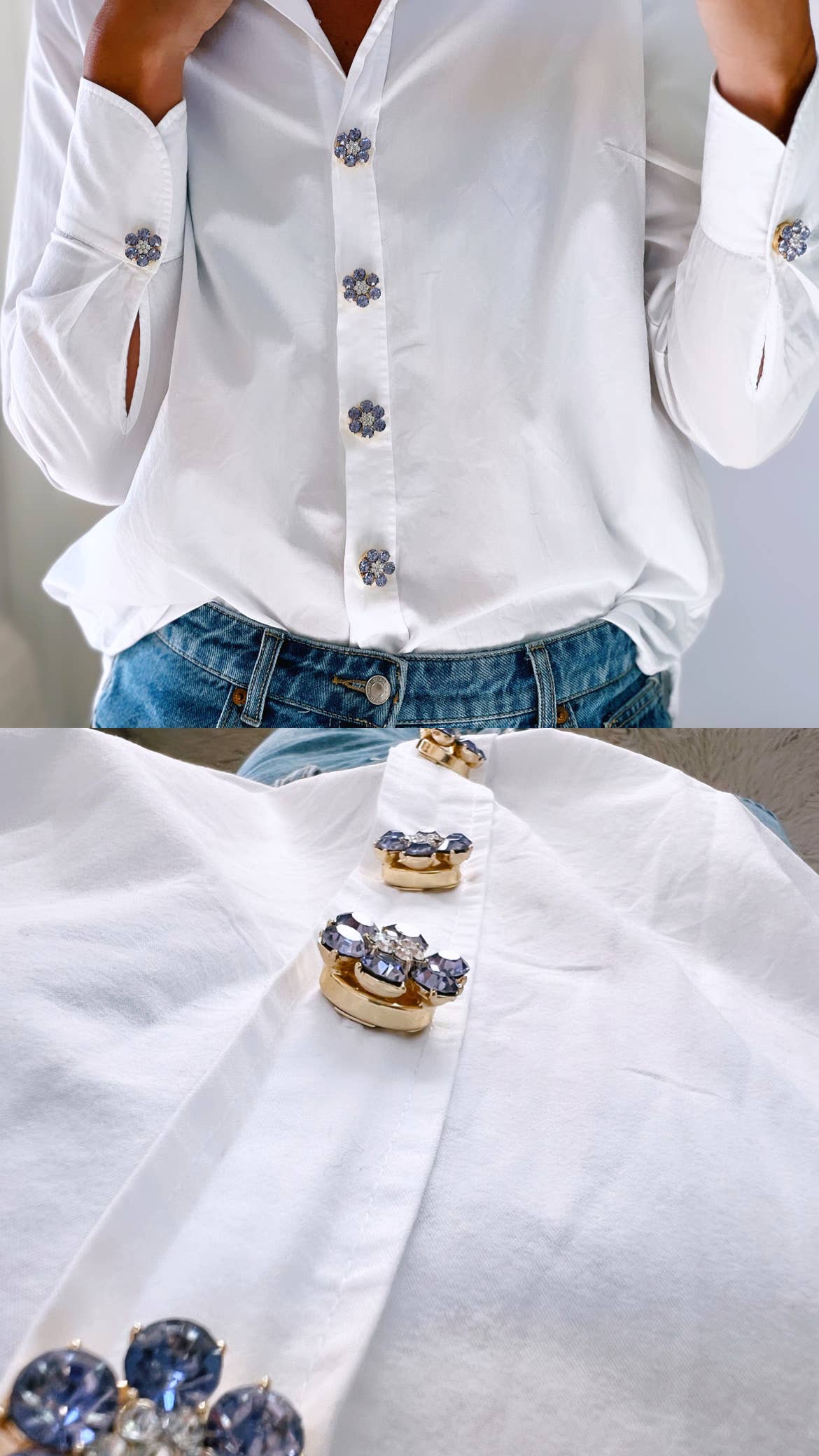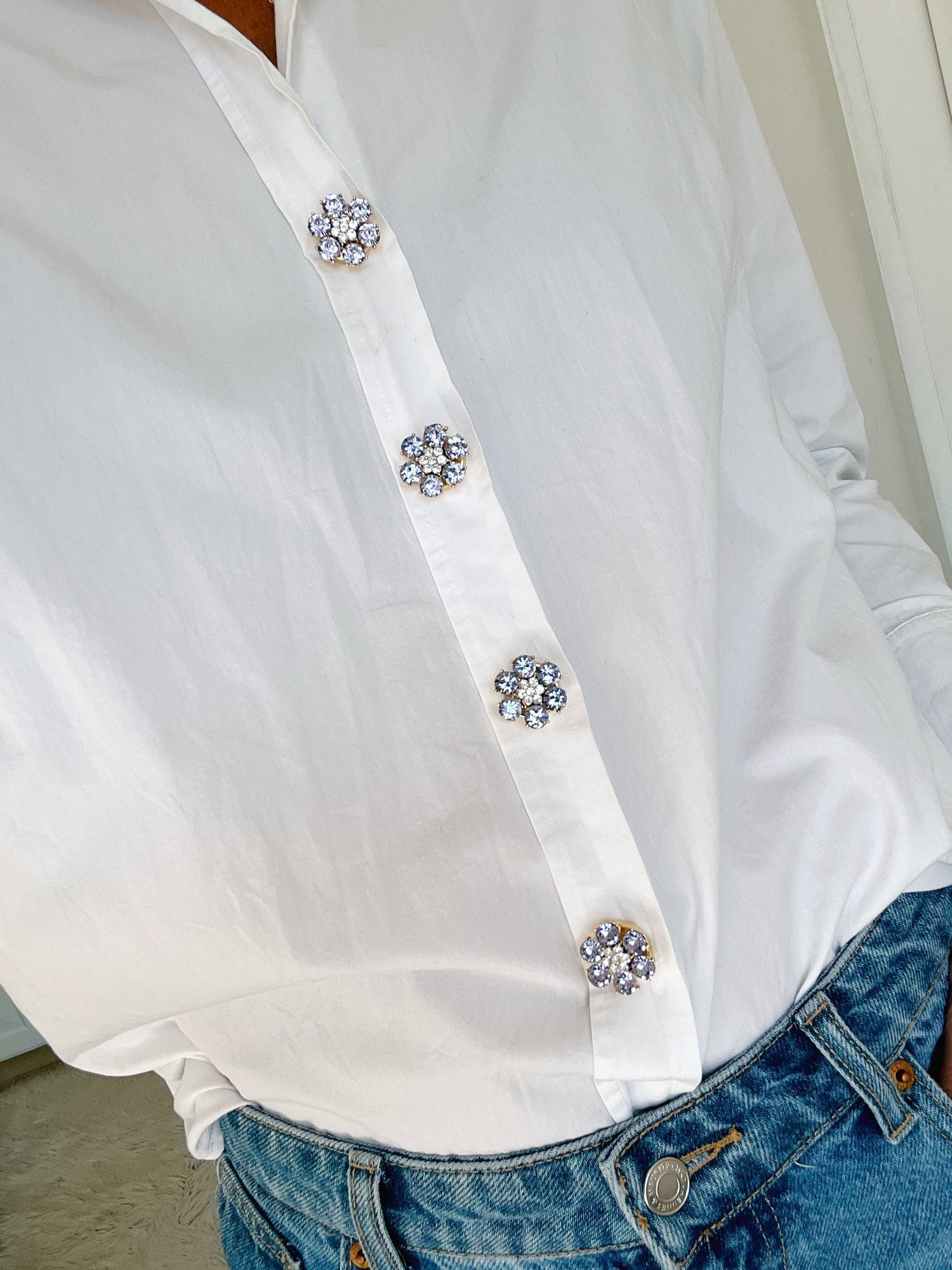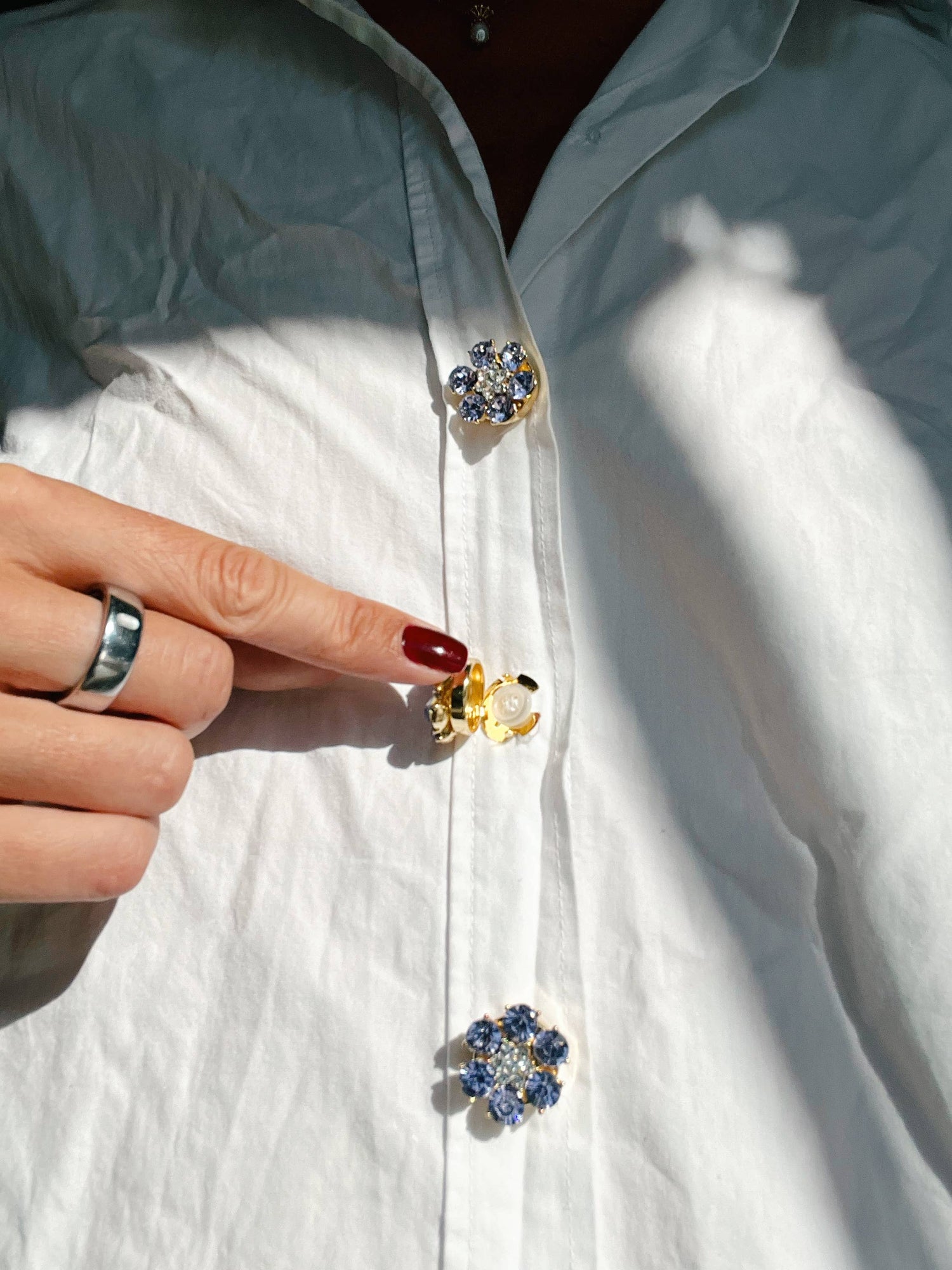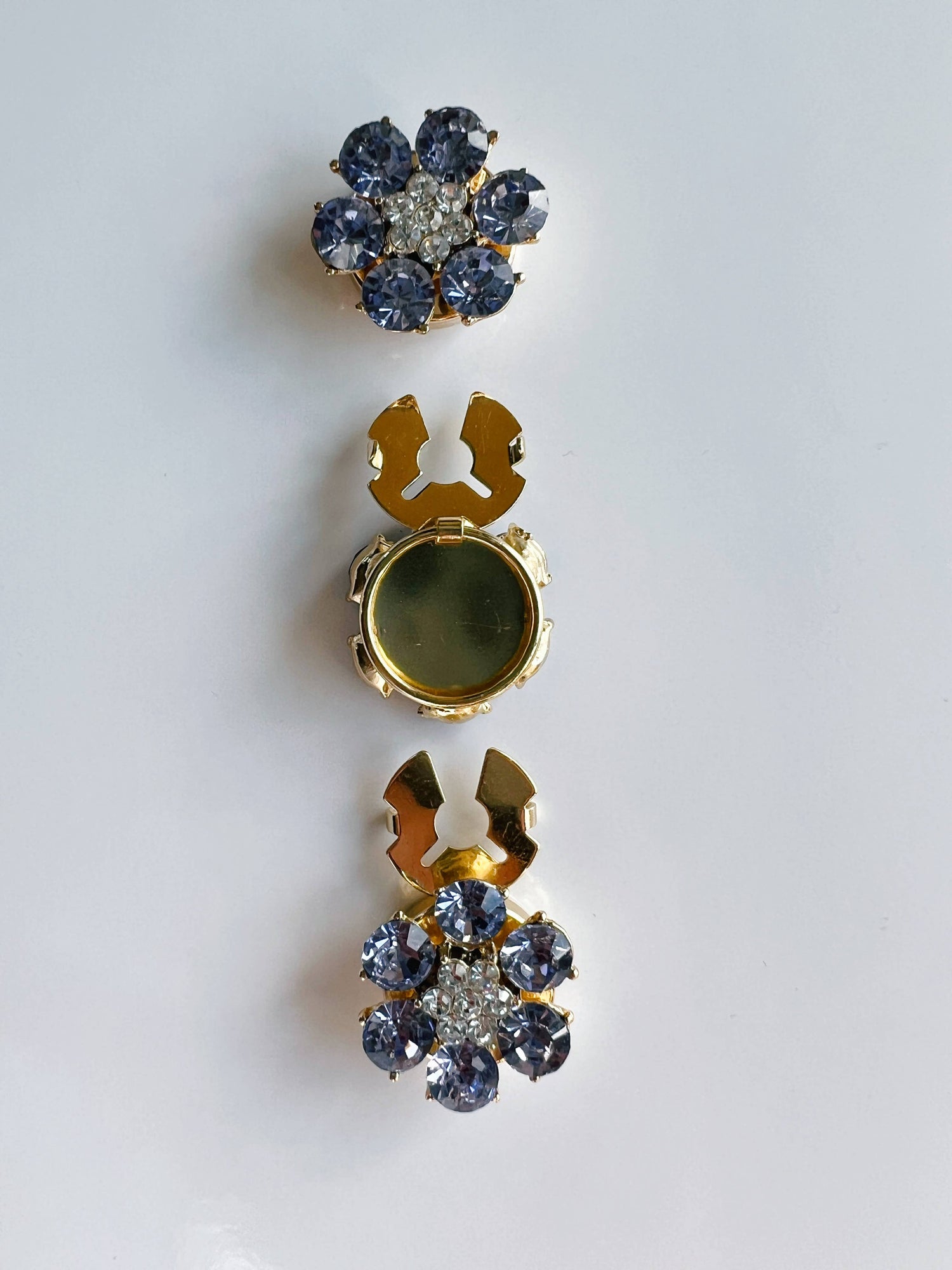 This charm is designed to click onto a standard button – turning everyday garments into something special. Hilde features six round purple stones forming a classic flower shape, with tiny white crystals sparkling at the center. The gold-tone base adds a soft and elegant finish. Named after my oma Hildegard – a radiant woman who inspired its name.