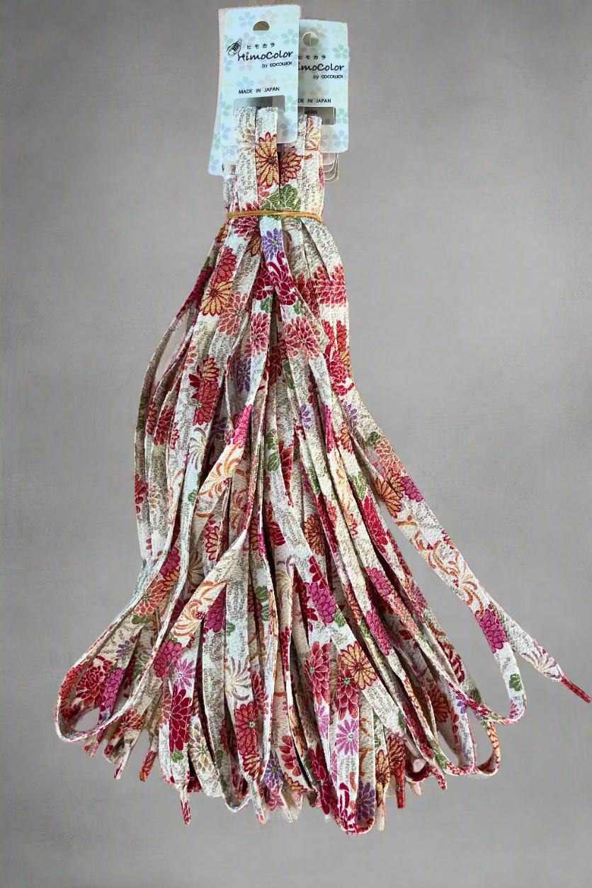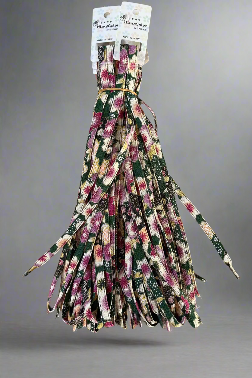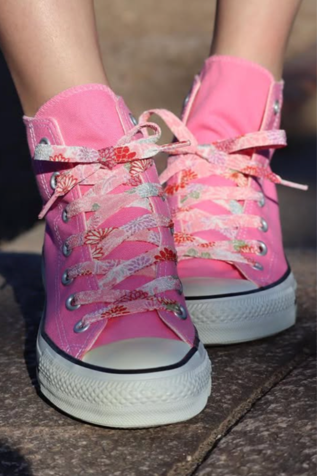 Transform your everyday shoes! These unique Japanese shoelaces are made from traditional CHIRIMEN material. Chirimen is a very popular and exclusive fabric from Japan and used for traditional clothing. These patterned shoelaces can transform the look of your sneakers from cool to cute, depending on the color and pattern. The polyester crepe laces have vibrant colors, are durable, and can be tied securely. They won't shrink or fade even when wet in the rain. If they get dirty, they can be hand washed. With over 30 color variations, the stitching is carefully selected and sewn to perfection. Made in Japan