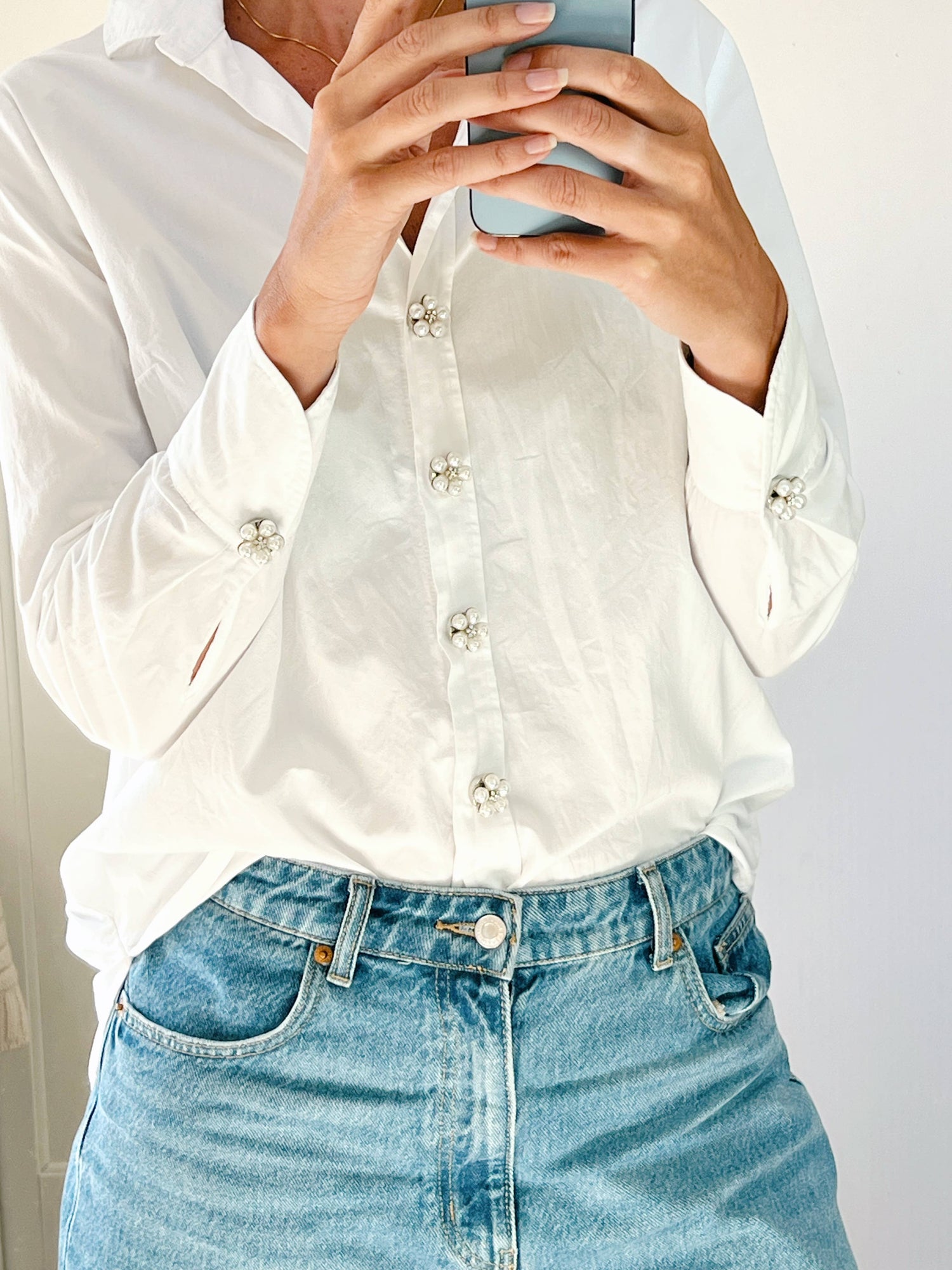 This flower-shaped charm features soft white pearl petals, a sparkling crystal center, and a silver-tone base. A delicate yet striking design that transforms any button into jewelry.