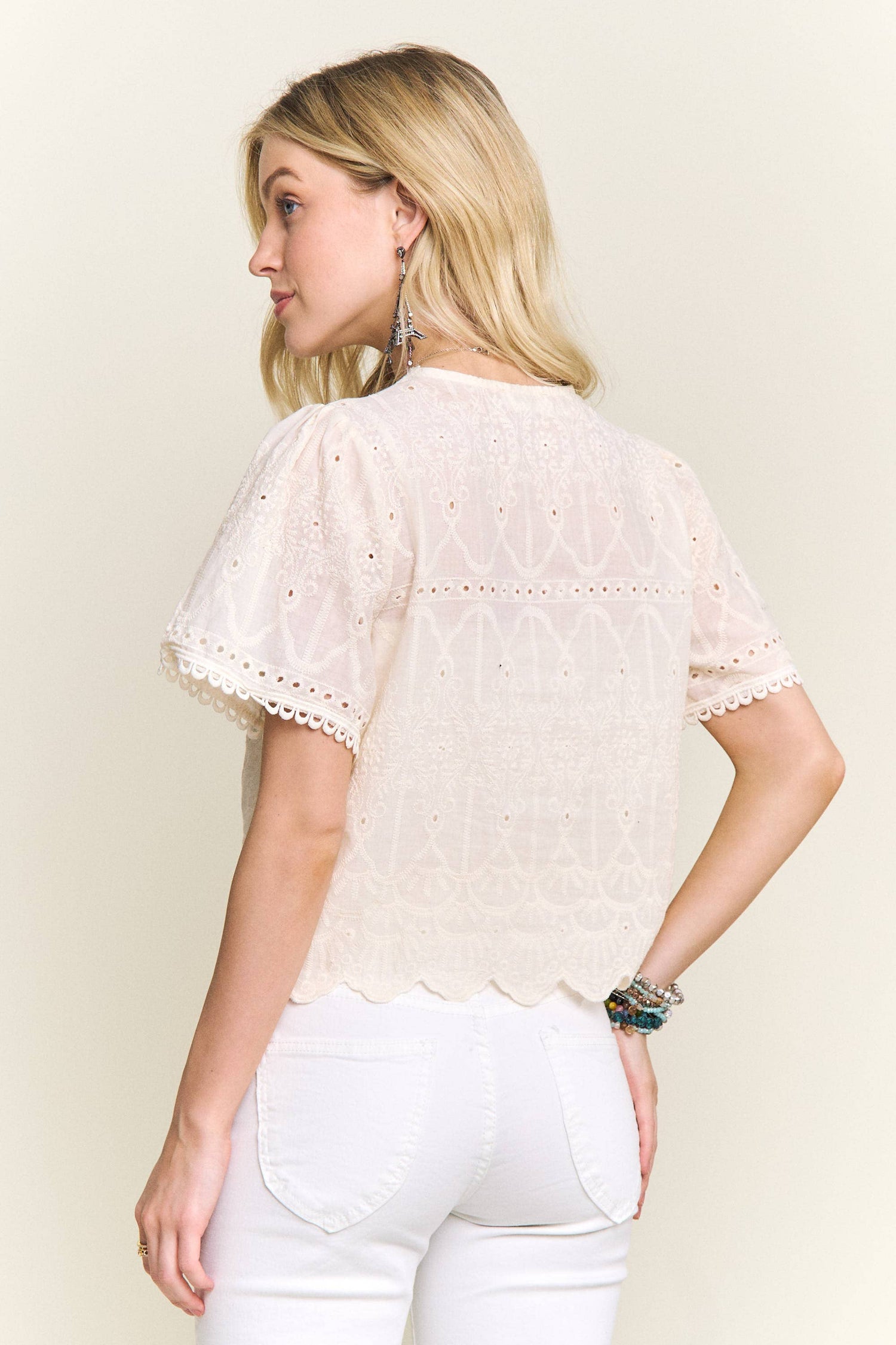 This airy blouse is crafted from 100% cotton, offering breathability and a soft feel against the skin. Its V-neckline is adorned with delicate lace trim, creating a charming focal point. A drawstring closure with tassels and beads adds a touch of bohemian flair, further enhanced by intricate embroidery and eyelet details throughout the garment. The short, flutter sleeves and scalloped hem contribute to its relaxed, free-spirited aesthetic.